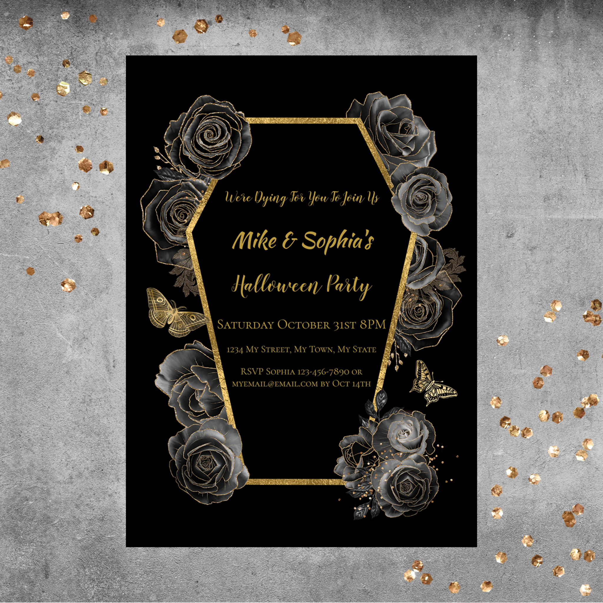 Black & Gold Roses Coffin Adult Halloween Party Invitation