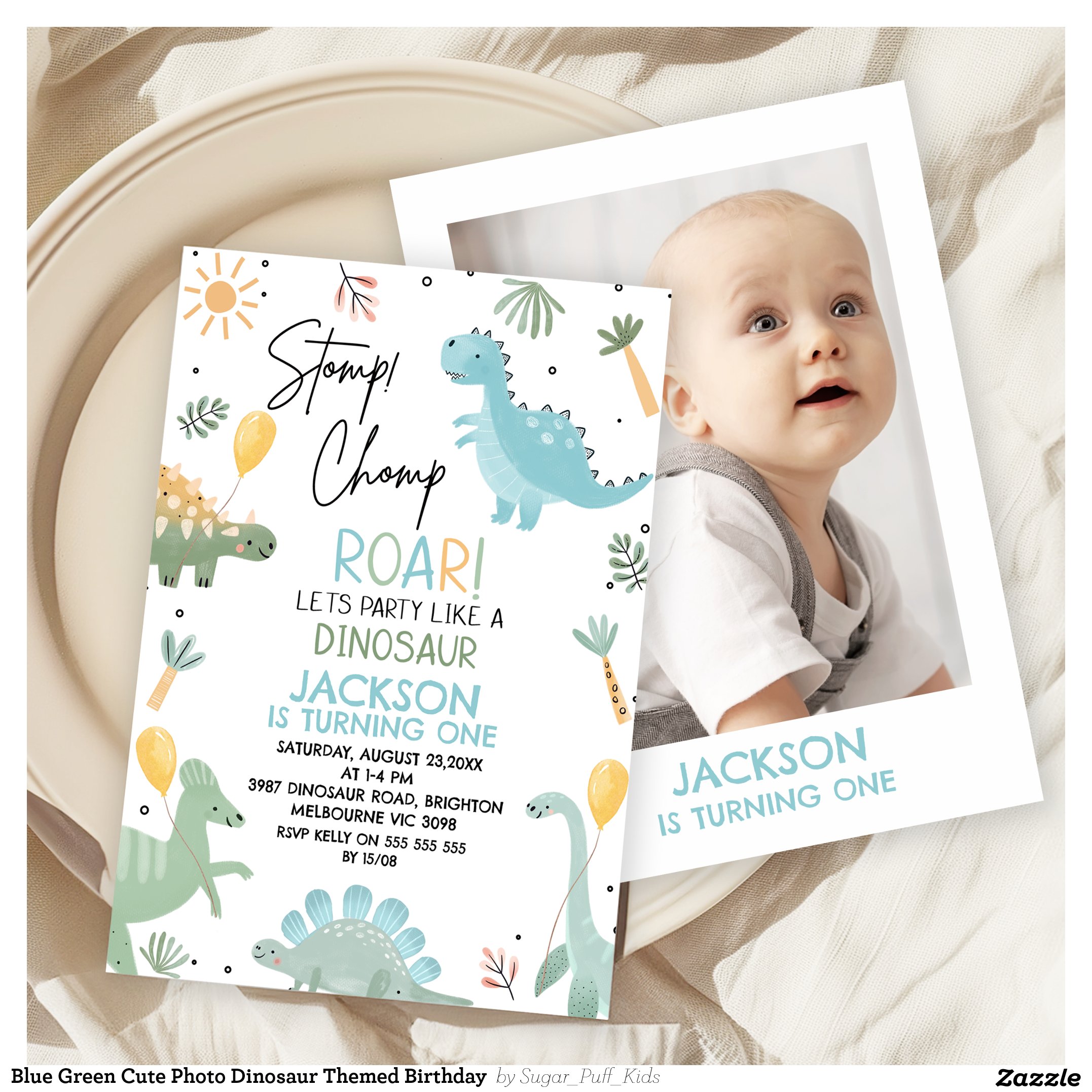 Blue Green Cute Photo Dinosaur Themed Birthday Invitation
