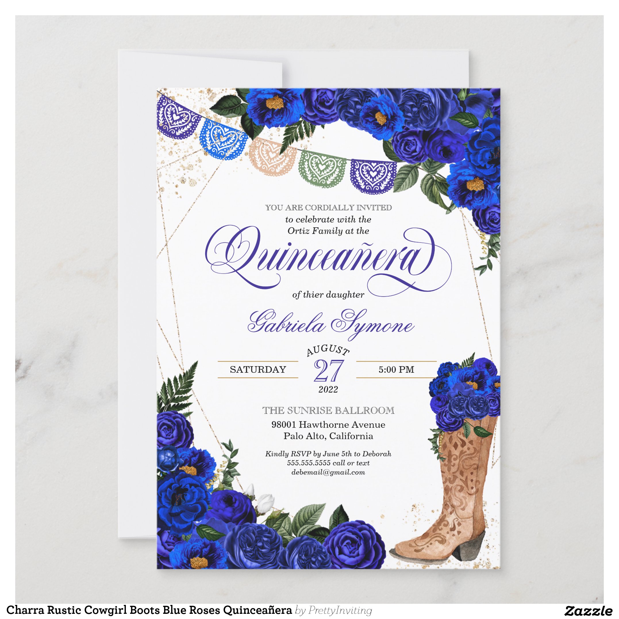 Charra Rustic Cowgirl Boots Blue Roses Quincea?era Invitation