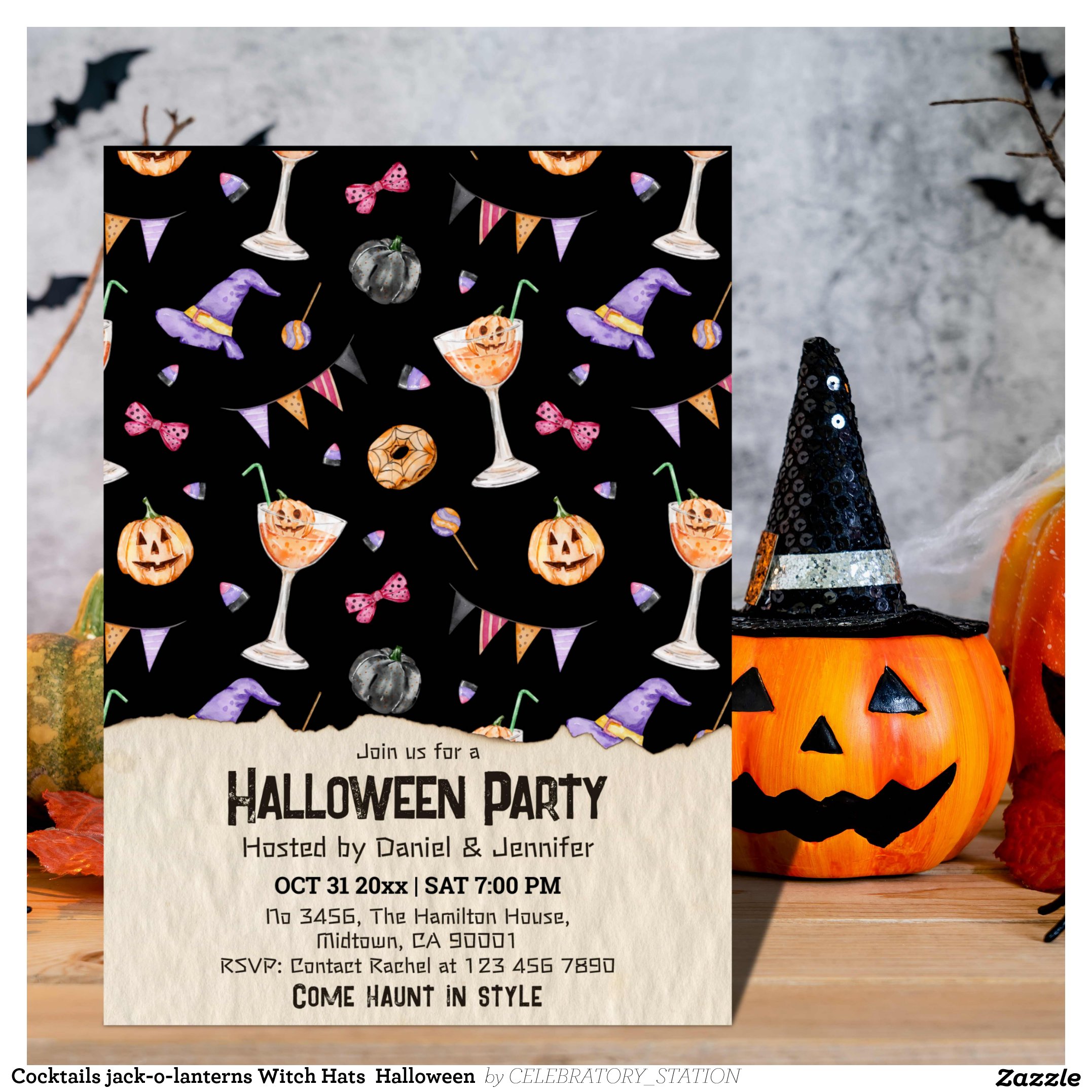 Cocktails jack-o-lanterns Witch Hats Halloween Invitation