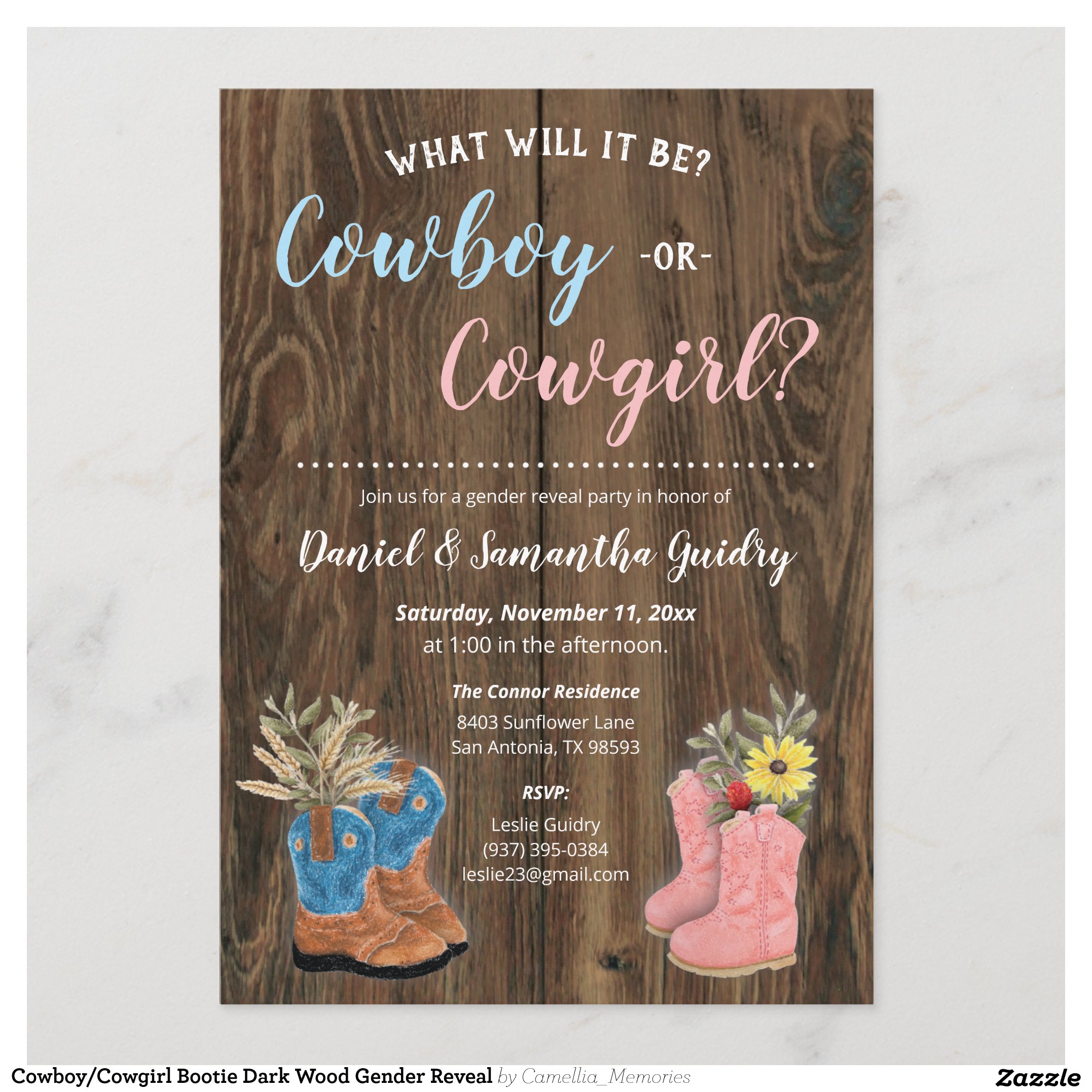 Cowboy/Cowgirl Bootie Dark Wood Gender Reveal Invitation