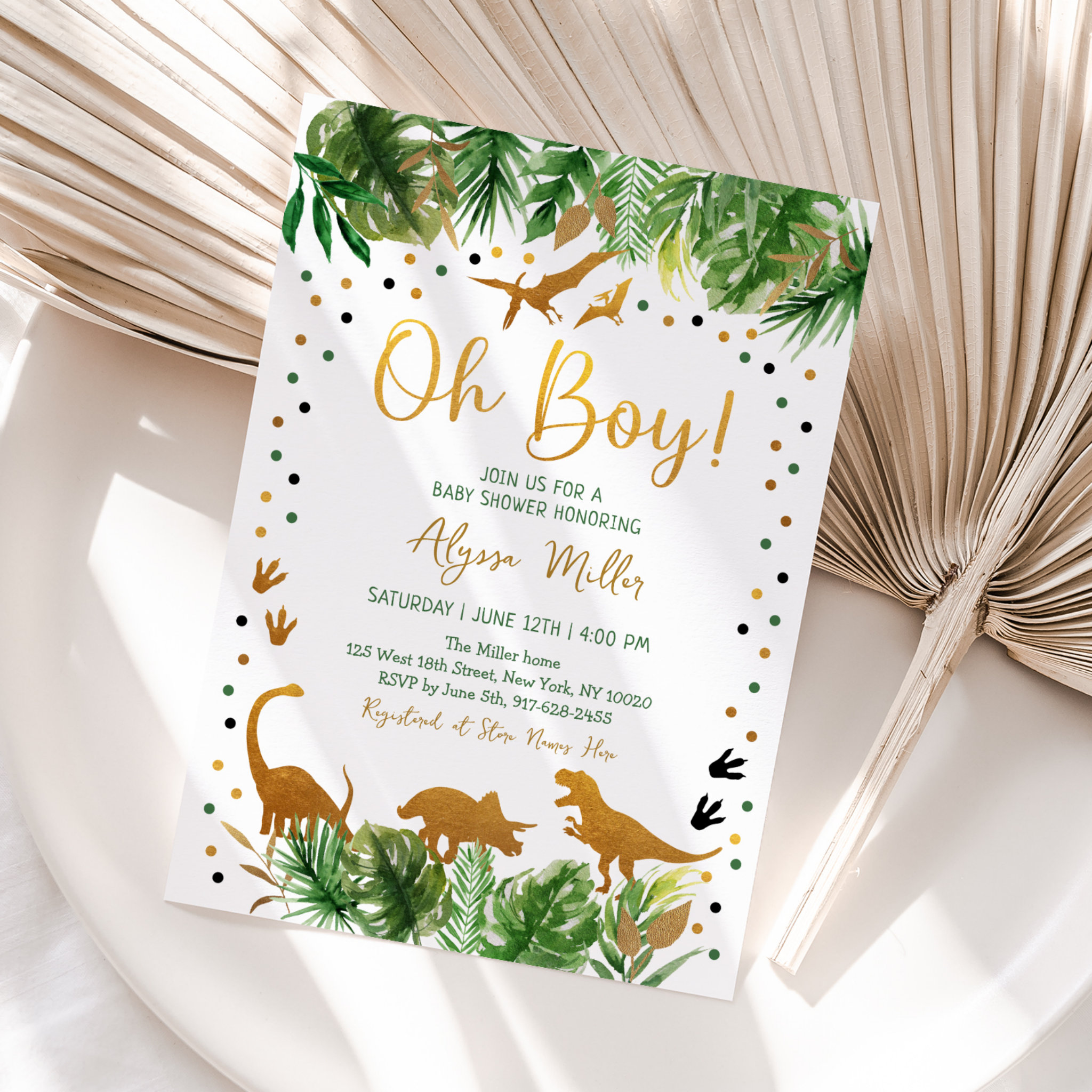 Dinosaur Greenery Gold Baby Shower Invitation