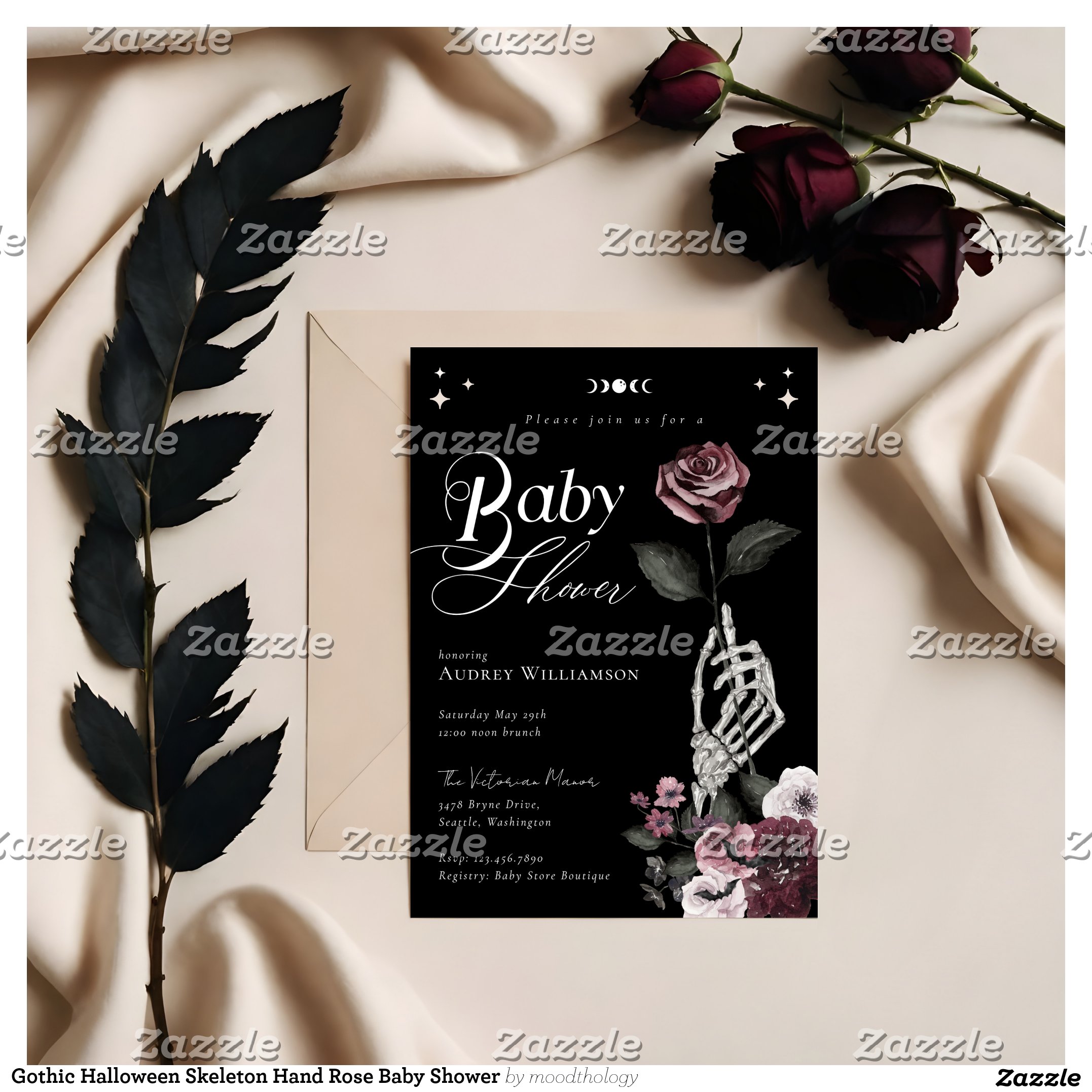 Be the first to review “Gothic Halloween Skeleton Hand Rose Baby Shower Invitation”