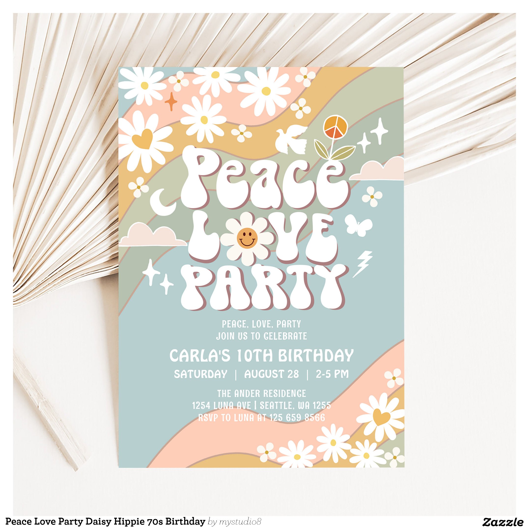 Peace Love Party Daisy Hippie 70s Birthday Invitation