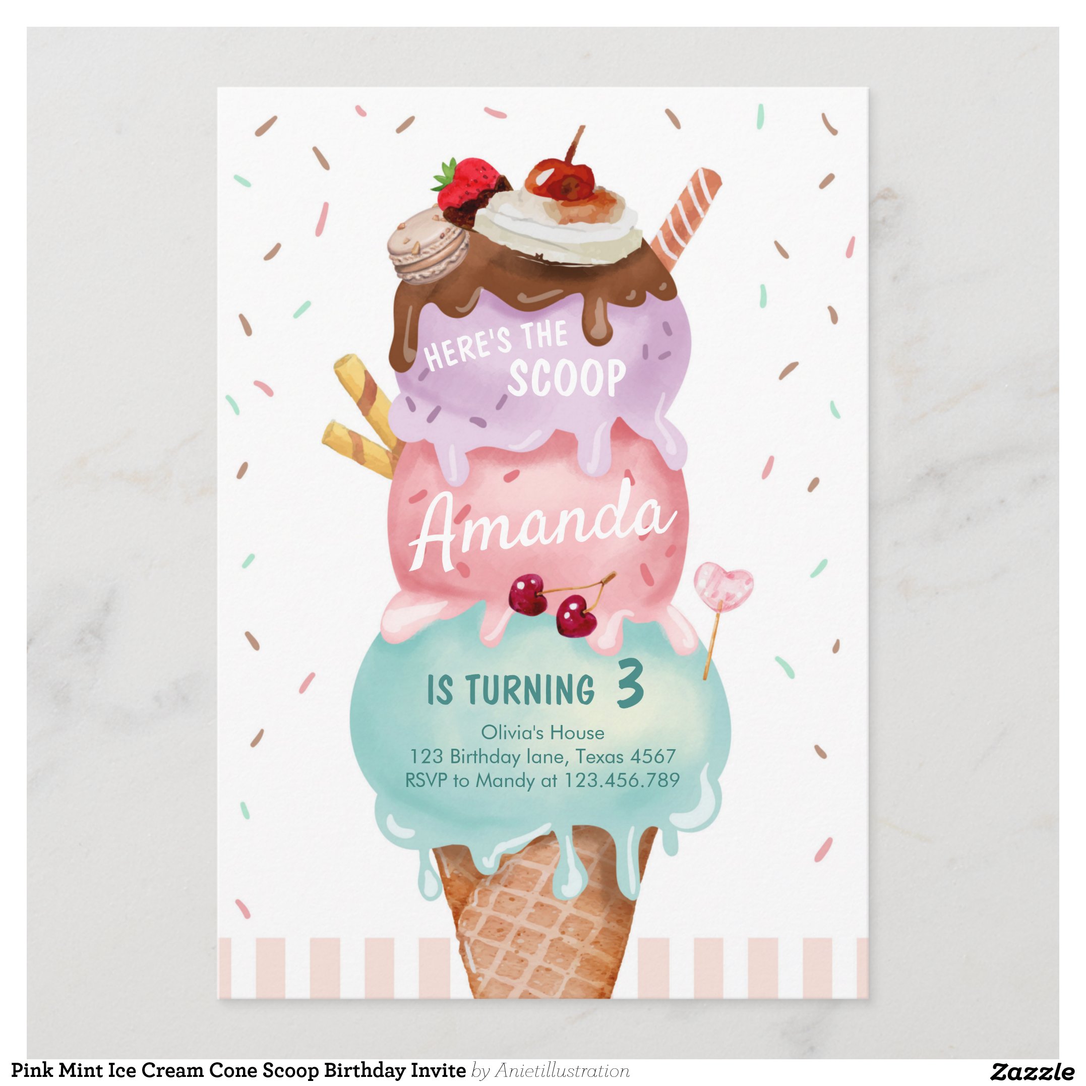 Pink Mint Ice Cream Cone Scoop Birthday Invite