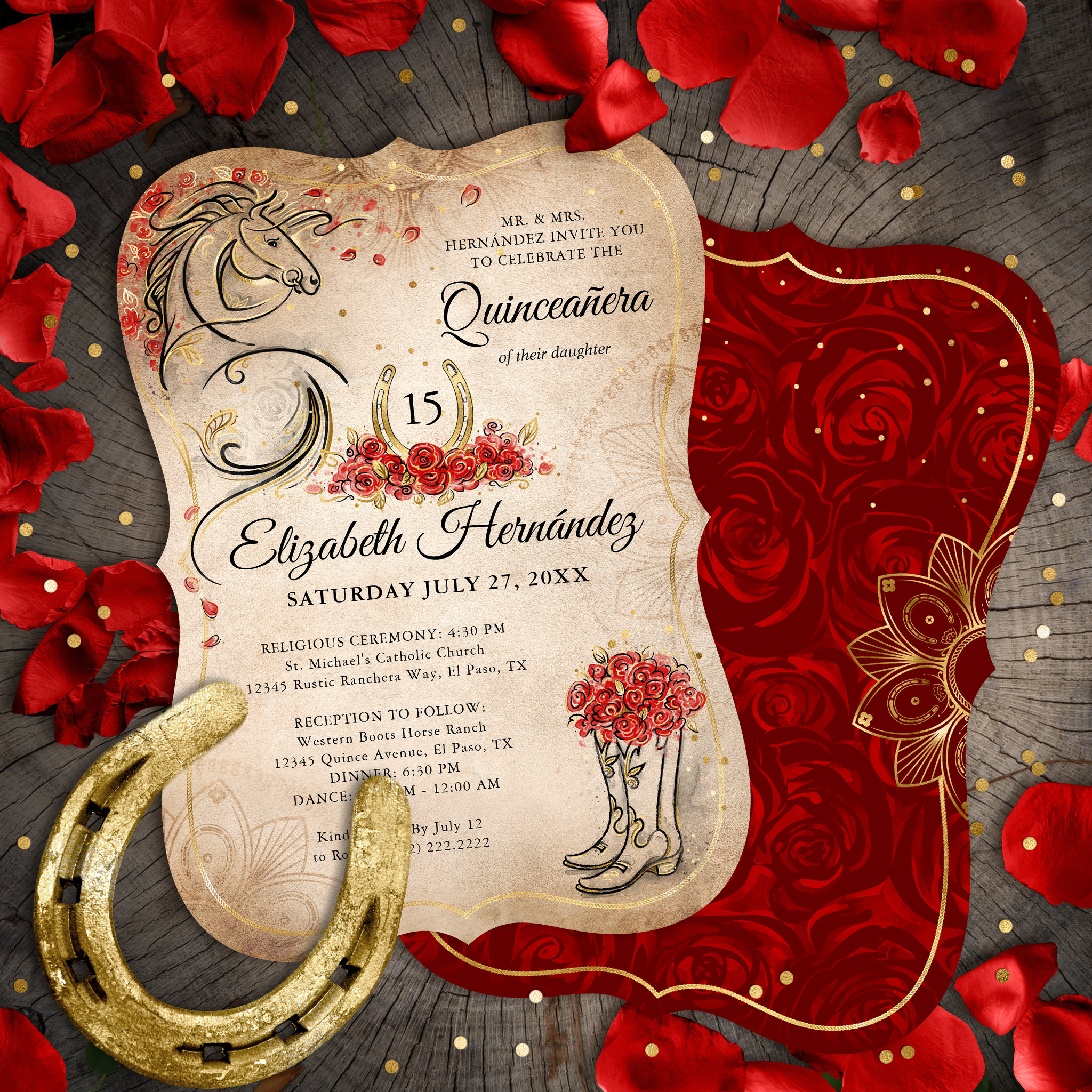 Be the first to review “Red and Gold Rustic Ranchera Mexican Quinceanera Invitation”