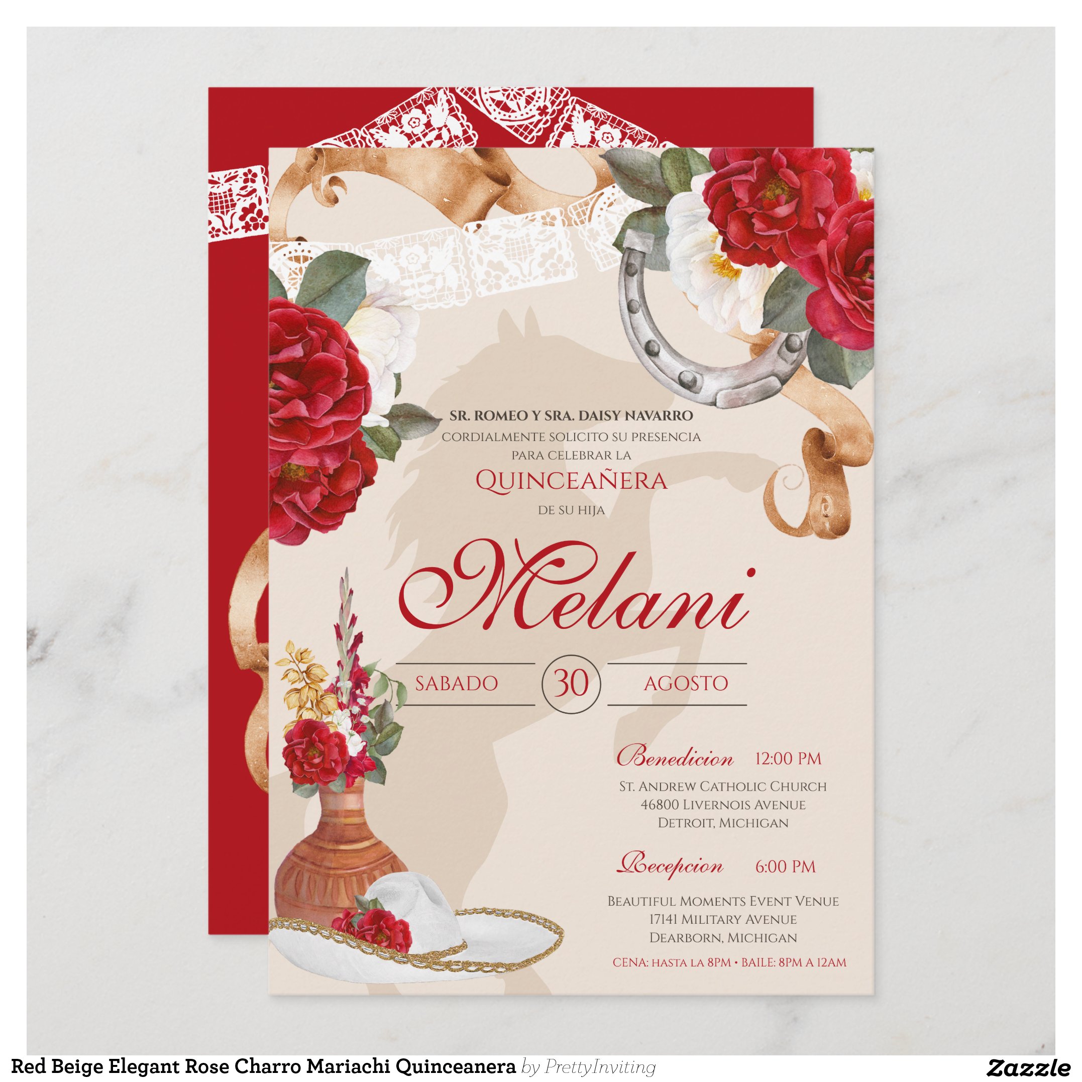 Red Beige Elegant Rose Charro Mariachi Quinceanera Invitation