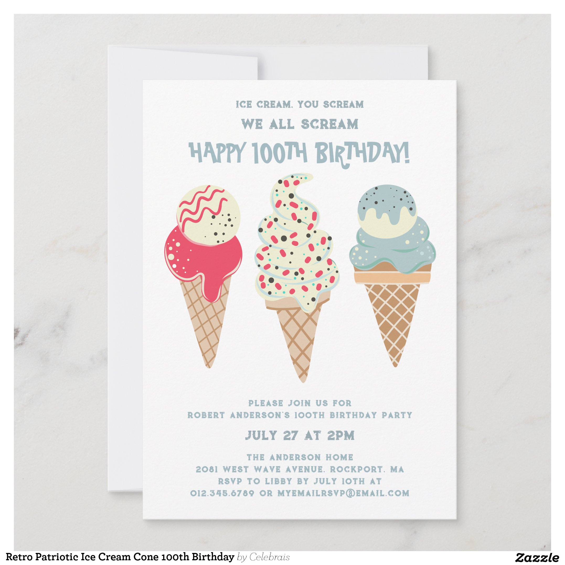 Retro Patriotic Ice Cream Cone 100th Birthday Invitation