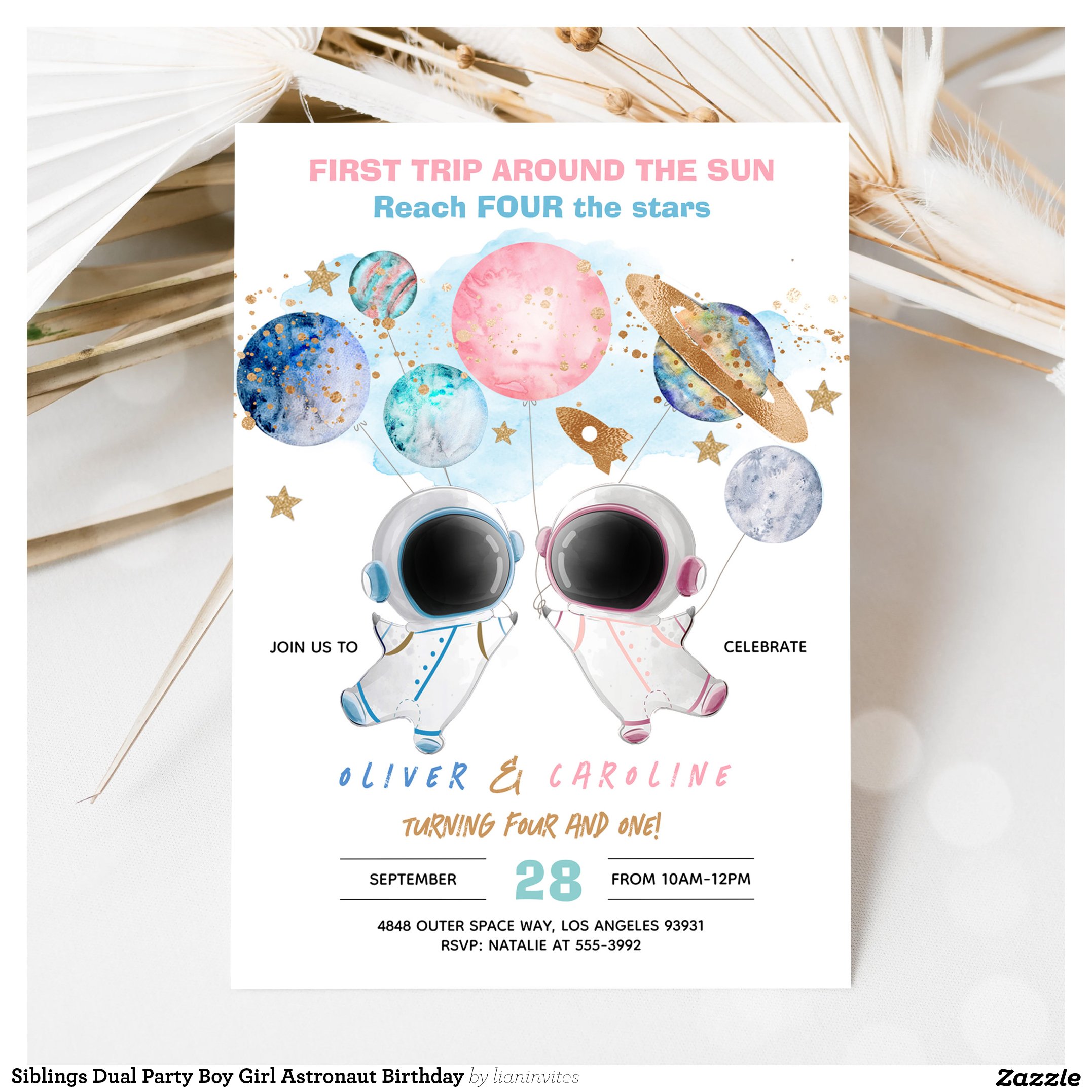 Siblings Dual Party Boy Girl Astronaut Birthday Invitation