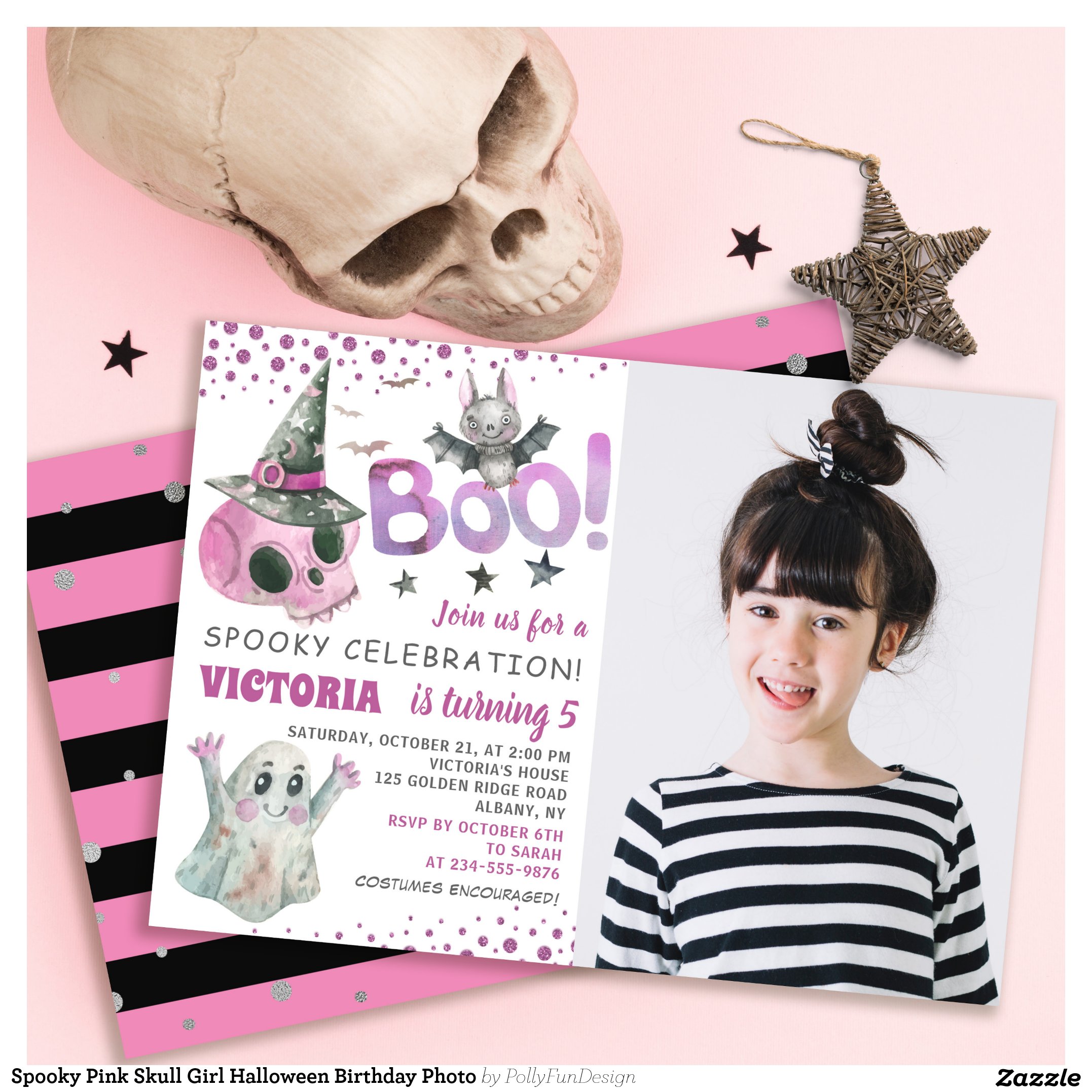 Spooky Pink Skull Girl Halloween Birthday Photo Invitation
